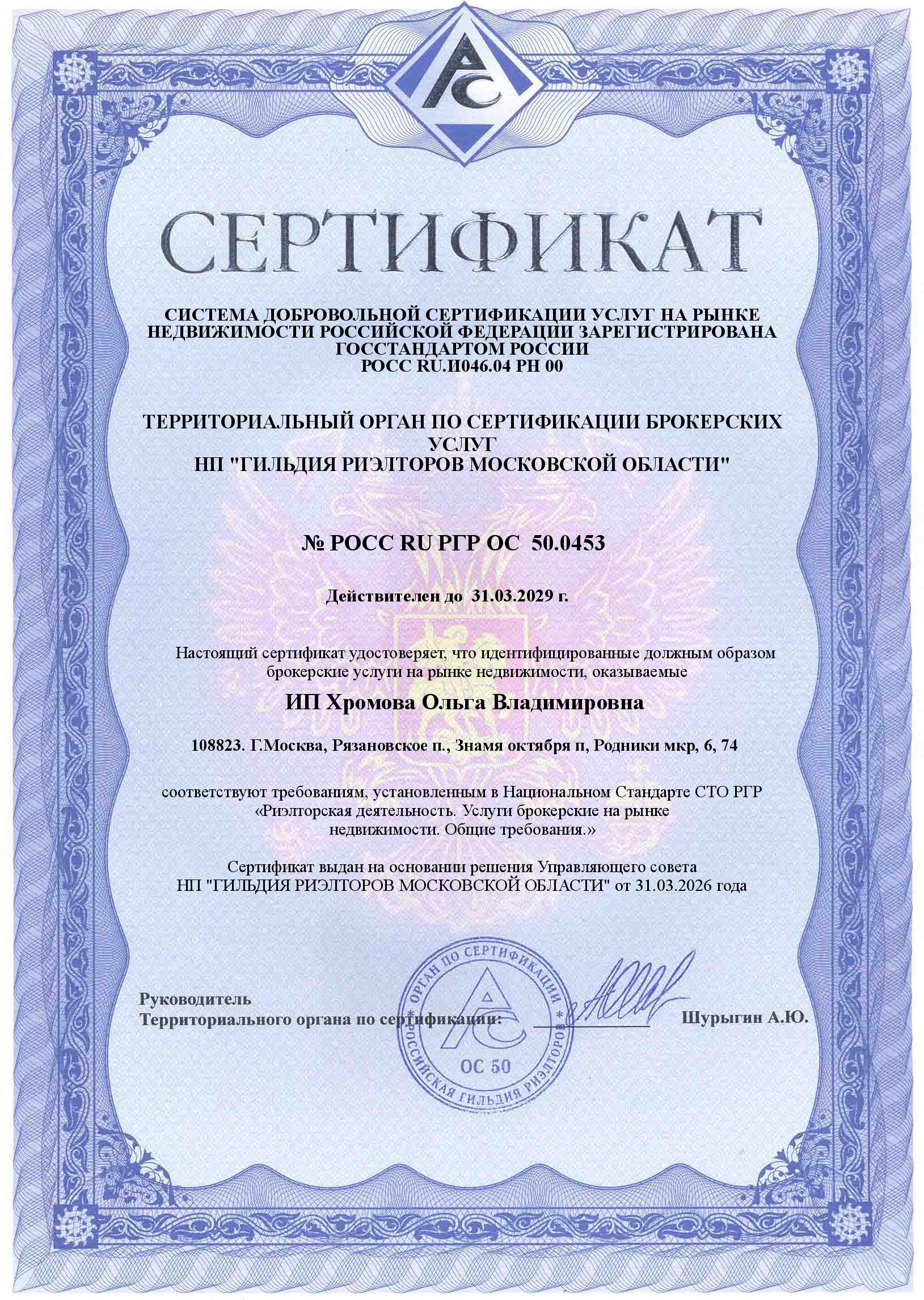 Риэлторские (брокерские) услуги ОО "Квартирный вопрос" сертифицированы. Сертификат №РОСС RU РГР ОС 50.0453 (срок действия - до 31.03.2029 года) удостоверяет, что оказываемые нашей фирмой услуги по операциям с недвижимостью соответствуют требованиям Национального Стандарта.