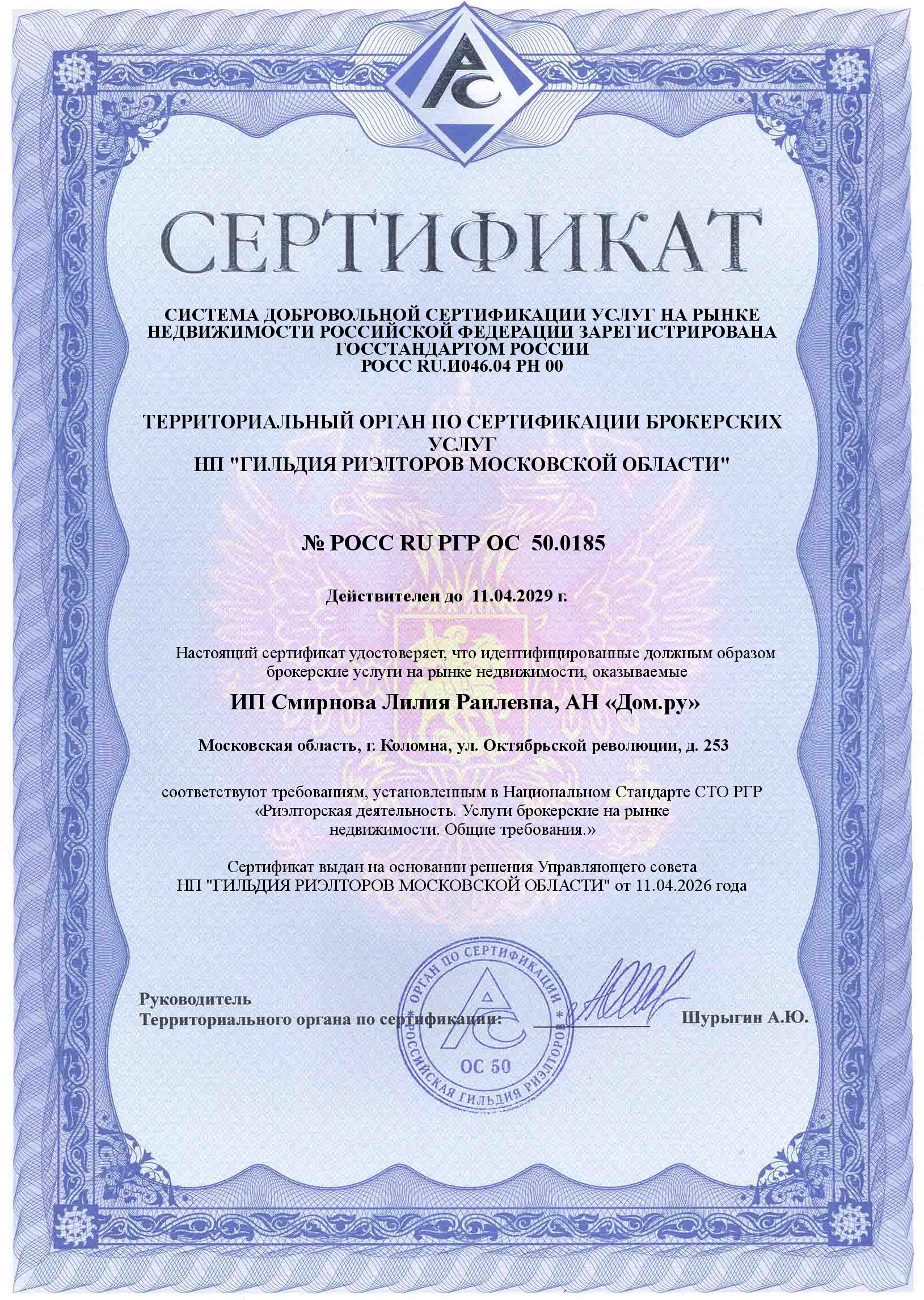 Риэлторские (брокерские) услуги ИП Смирнова Лилия Раилевна, АН «Дом.ру» сертифицированы. Сертификат № РОСС RU РГР ОС.50.0185 (срок действия - до 11.04.2029 года) удостоверяет, что оказываемые нашей фирмой услуги по операциям с недвижимостью, соответствуют требованиям Национального Стандарта.