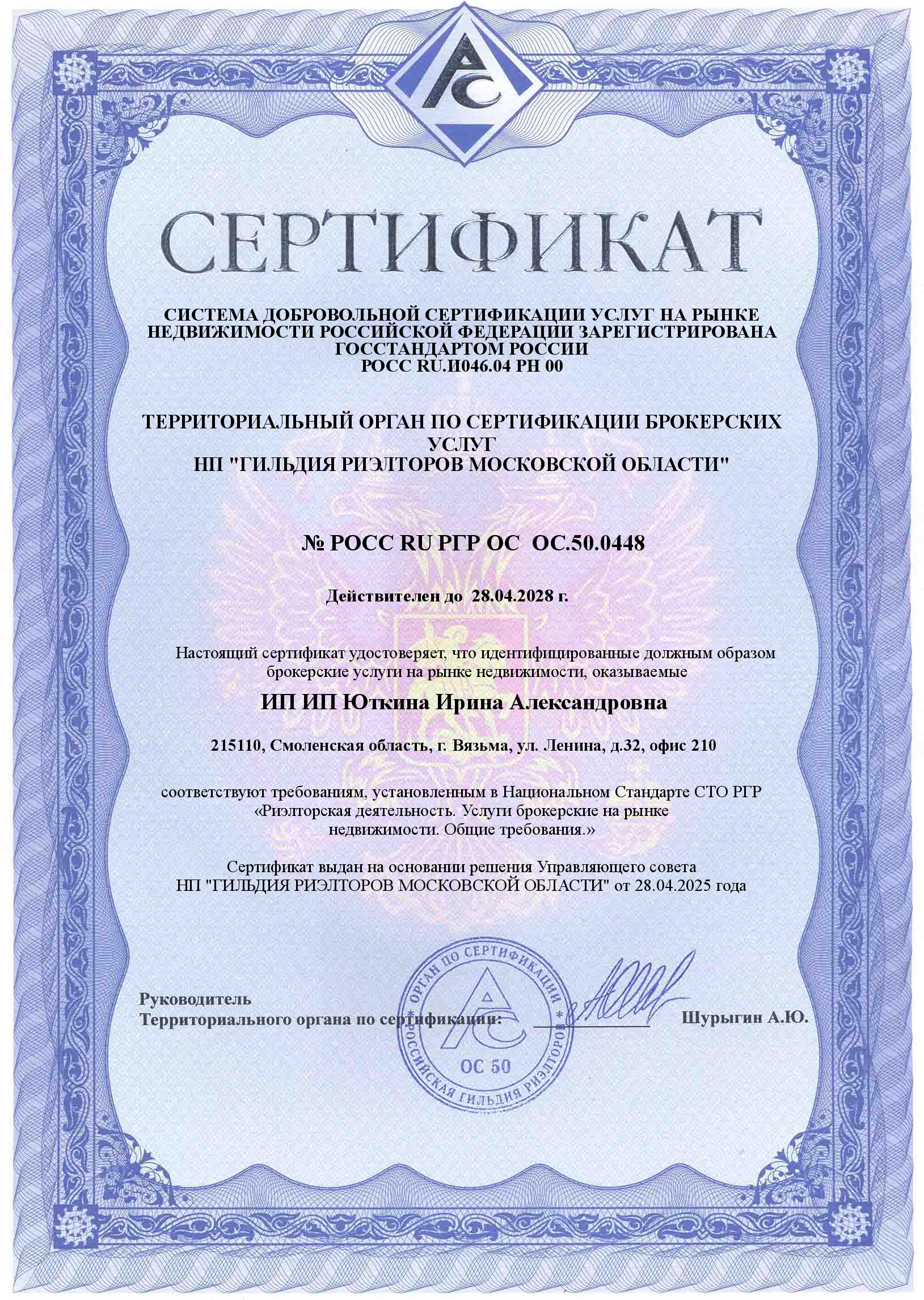 Риэлторские (брокерские) услуги ИП Юткиной И.А. сертифицированы. Сертификат № РОСС RU РГР ОС.50.0448 (срок действия - до 28.04.2028 года) удостоверяет, что оказываемые фирмой услуги по операциям с недвижимостью, соответствуют требованиям Национального Стандарта.