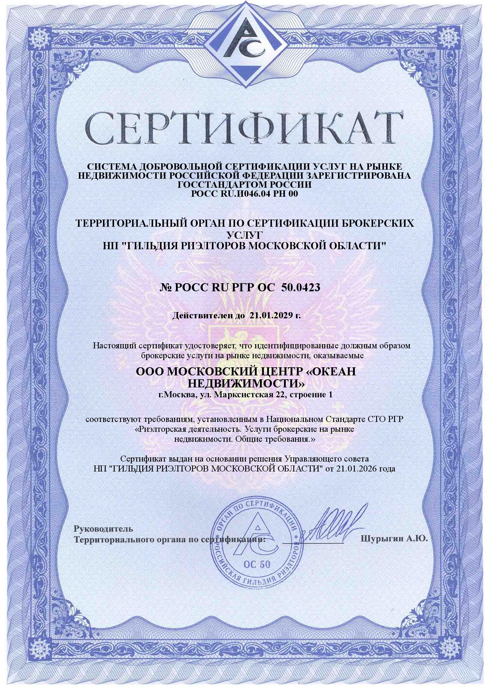 Риэлторские (брокерские) услуги ООО МОСКОВСКИЙ ЦЕНТР «ОКЕАН НЕДВИЖИМОСТИ» сертифицированы. Сертификат № РОСС RU РГР ОС.50.0423 (срок действия - до 21.01.2029 года) удостоверяет, что оказываемые фирмой услуги по операциям с недвижимостью, соответствуют требованиям Национального Стандарта.