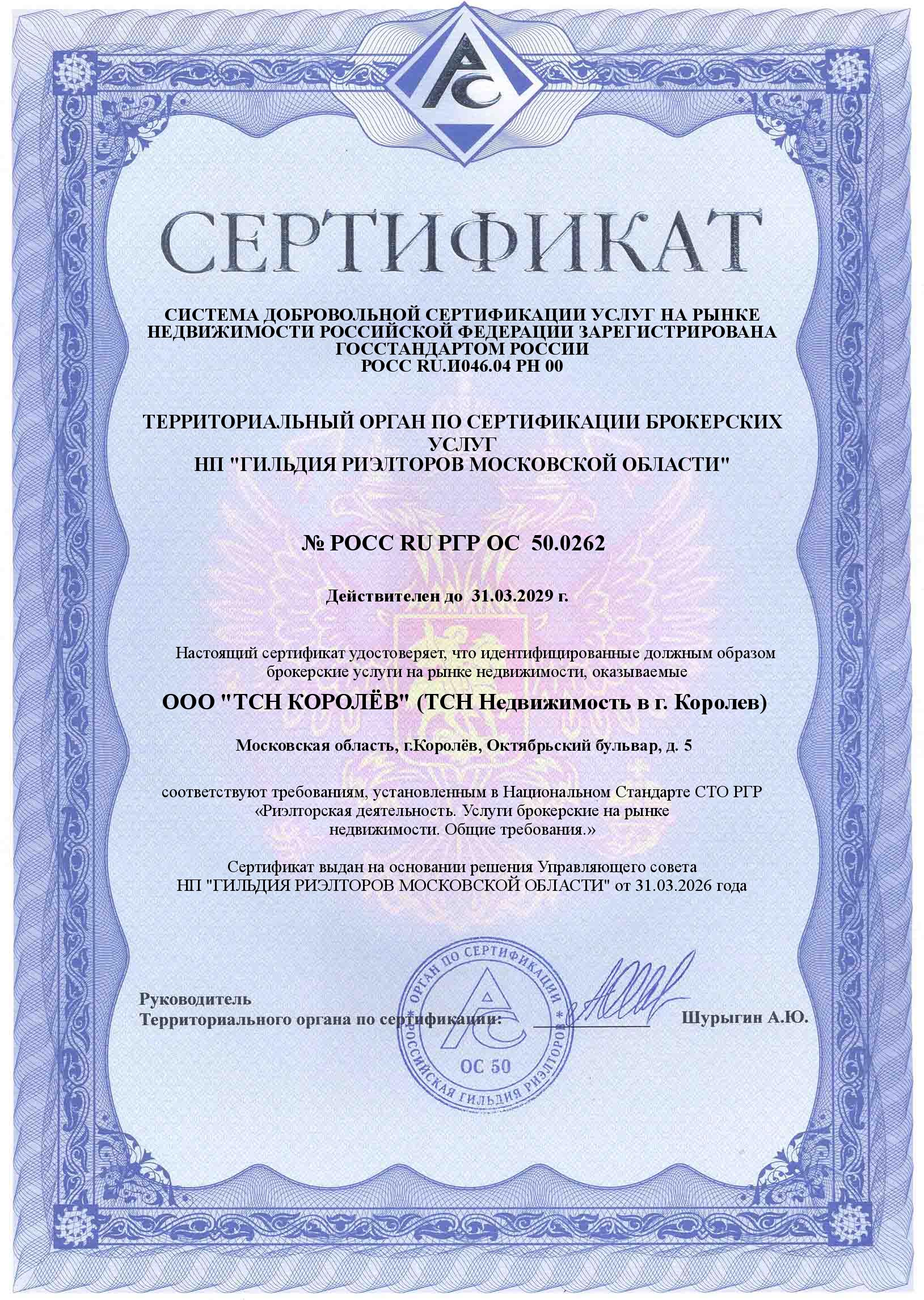Риэлторские (брокерские) услуги ООО "ТСН КОРОЛЁВ" сертифицированы. Сертификат № РОСС RU РГР ОС.50.0262 (срок действия - до 31.03.2029 года) удостоверяет, что оказываемые нашей фирмой услуги по операциям с недвижимостью, соответствуют требованиям Национального Стандарта.