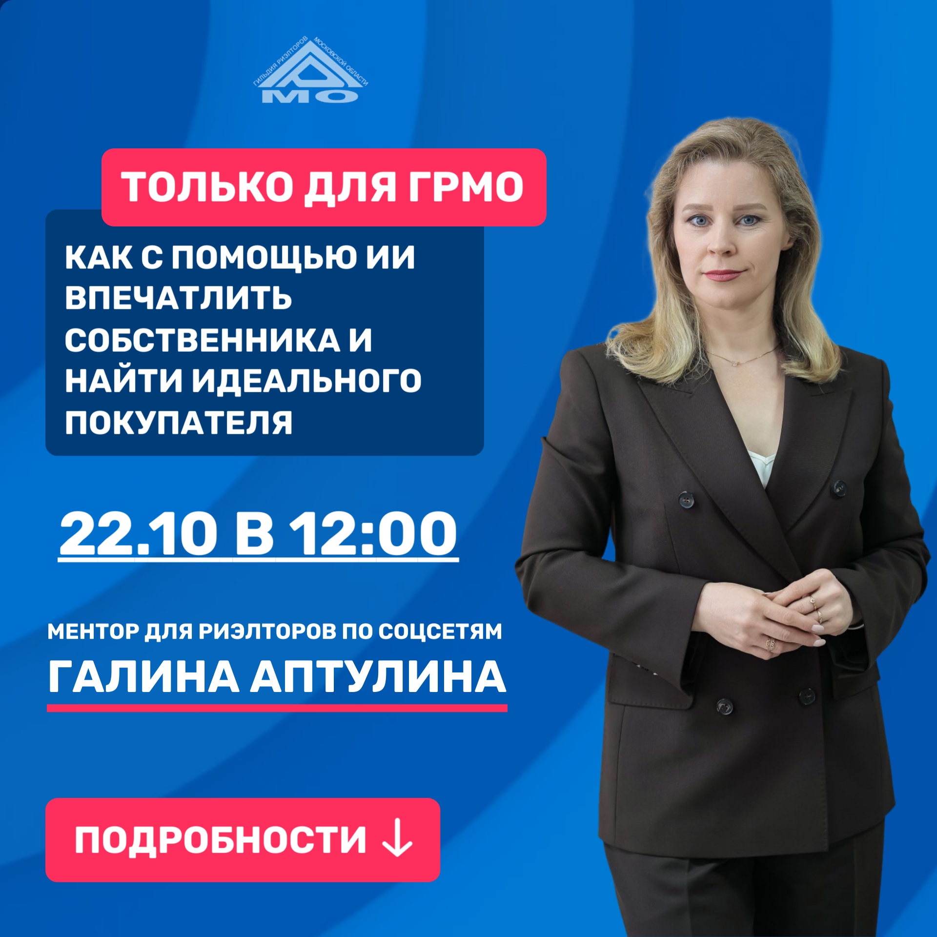 22 октября в 12:00 мск мы продолжаем работаем с Галиной Аптулиной! Тема встречи: «Как с помощью ИИ впечатлить собственника и найти идеального покупателя: описание, маркетинг план».