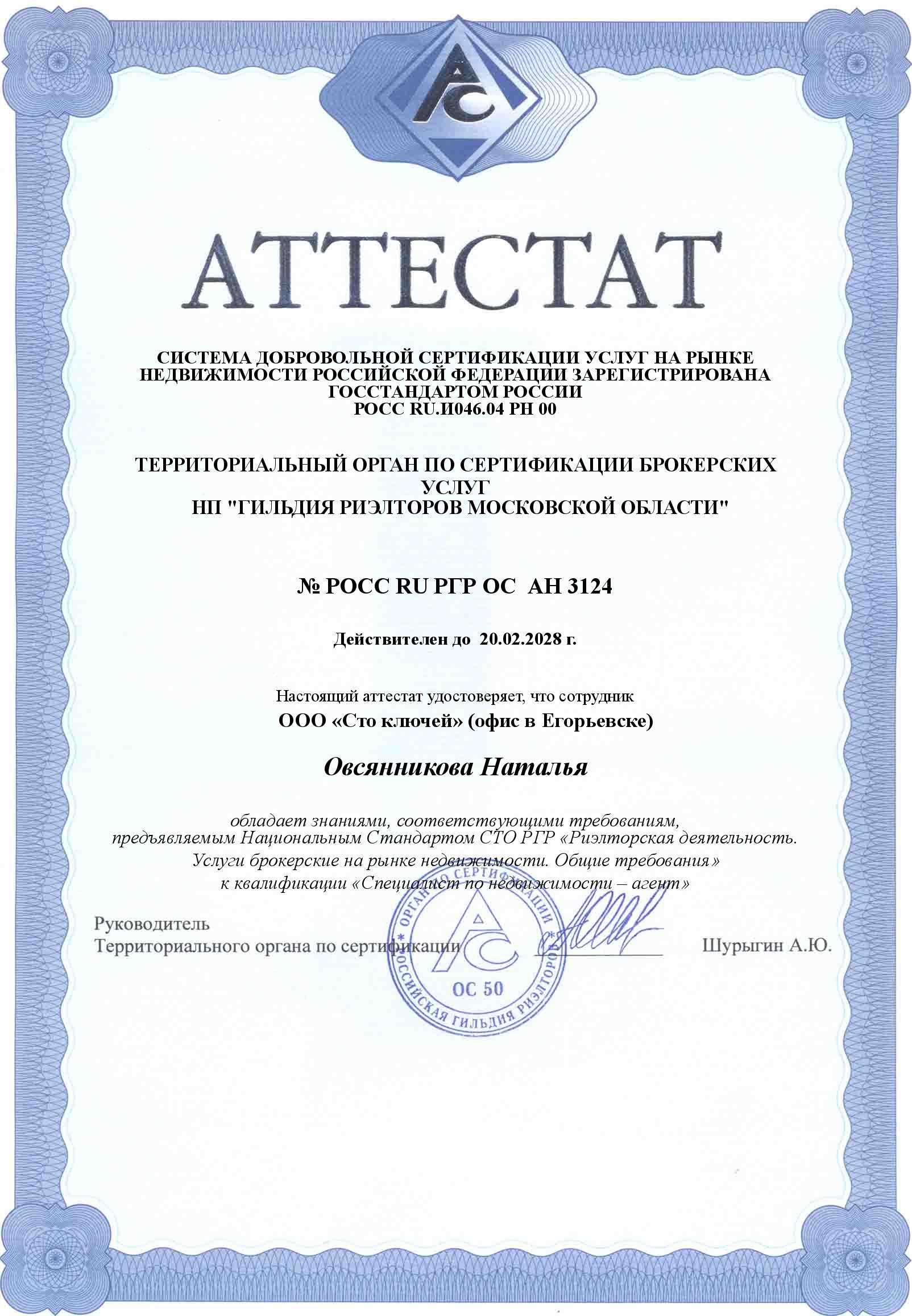 № аттестата, срок действия аттестата